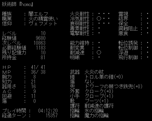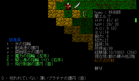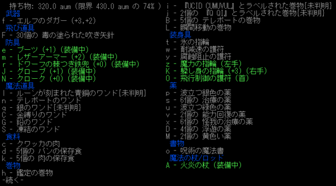 未判明のワンドと巻物が気になりますね。巻物のどちらかは魔力充填の巻物かもしれない。トロルの革の鎧は外しました。EVが下がるし変愚みたいに腹が減りやすくなったりしたら嫌だから(ソースはない)。