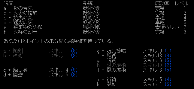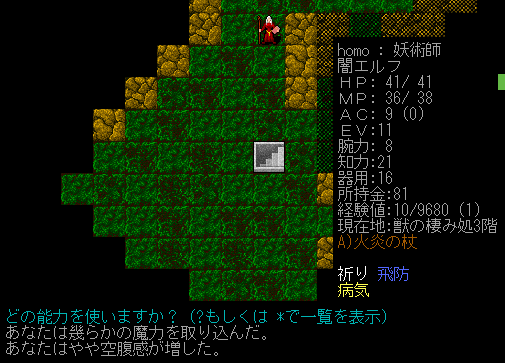 地下3階まで潜っても食料は1つしか落ちてなかった。空腹にイライラするけど、呪術の魔法を無駄に使用する。プレイ日記開始時点の呪術スキルは3、風の魔術は2レベルでした。どれくらい上がってくれるかな。