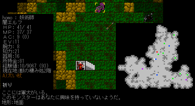 地下2階の地図は上の画像になります。大きな部屋が1つあるだけ。分かりやすいですね。呪術のスキルレベルを上げていたら軍犬が襲いかかってきました。こいつは食べられるから大好き。