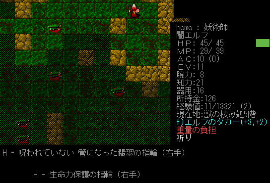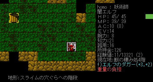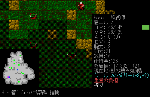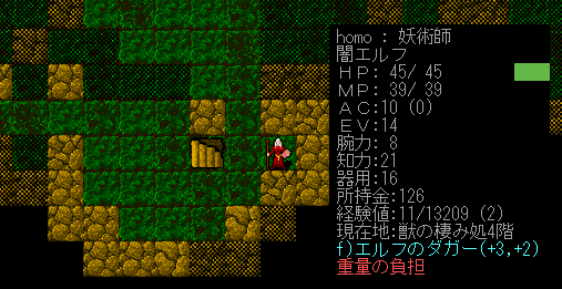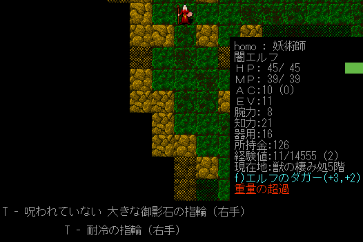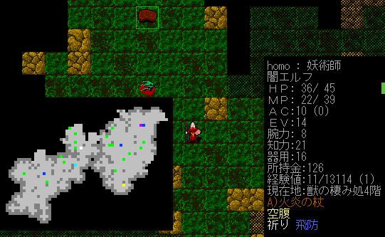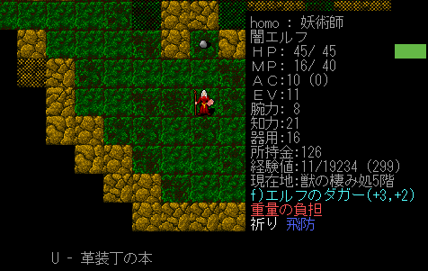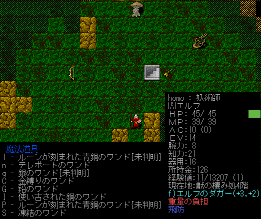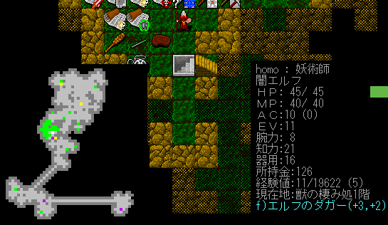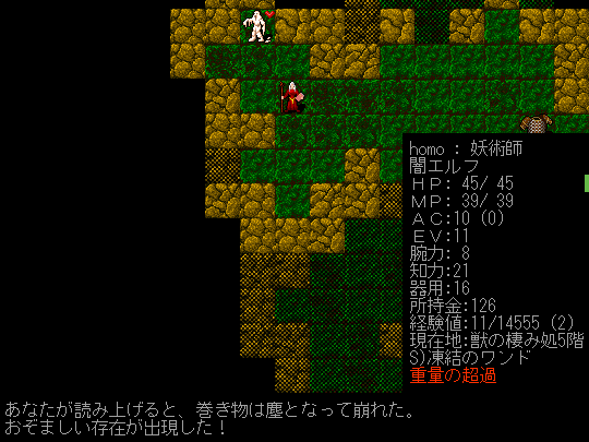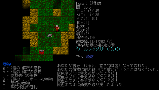 Dungeon Crawlのプレイ日記を始めます。闇エルフ炎の精霊使いをプレイ中です。前回は『獣の棲み処』の4階まで到達。まだヒドラは出てきていません。未鑑定の巻物とワンドが多いから鑑定をしたい。