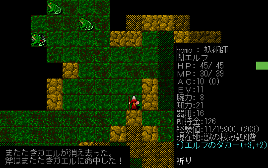 いきなりモンスターの姿が消えた!と思ったら、またたきガエルが出現。敵を貫く猛火の矢を連打したら運良く全滅させることに成功。こいつの肉は清浄だから食べられるみたいですね。意外でした。