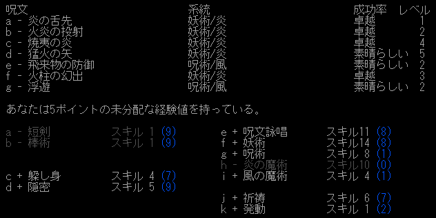 地下4階にて『ゾット』の声が聞こえました。これはゾットの罠があるというメッセージだよね。ゾットの罠はものすごく恐ろしくてアビス(送られたらだいたい死ぬ)に飛ばされたりします。地下4階を歩くときは浮遊を使おう。浮遊の魔法を学習しました。