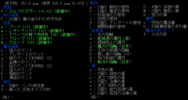 鑑定は『だんじょんひらおよぎ』を参考にしています。未鑑定の巻物は『i』と『j』の2つ。どちらかが魔力充填の巻物かもしれないためワンドを装備して巻物を読みます。『i』の『UCID・・・』は無為無作為の巻物かな?『j』の巻物は武器呪縛の巻物でした。