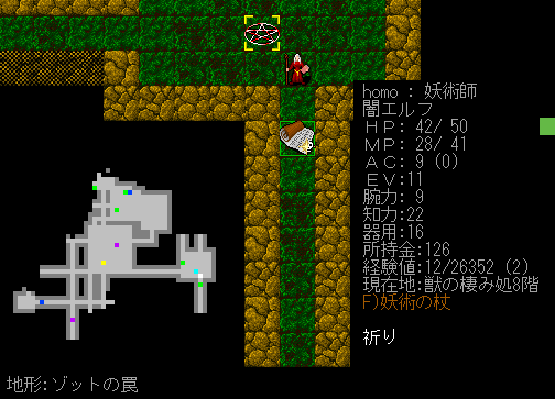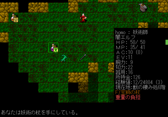 獲得の巻物により未鑑定の杖を手に入れました。呪文を使って正体が判明。普通に妖術の杖でした(笑)。
