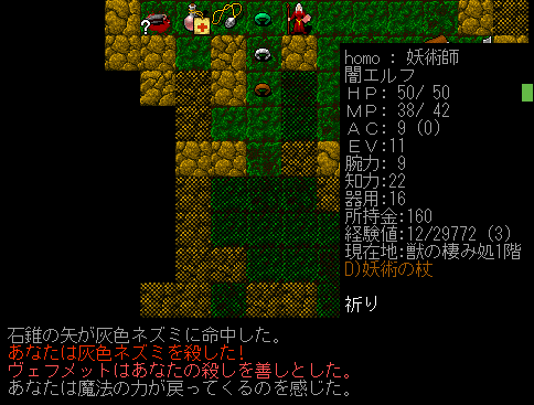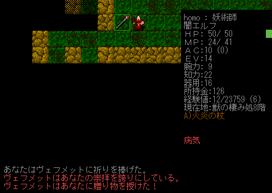 Dungeon Crawlのプレイ日記を始めます。闇エルフ炎の精霊使いをプレイ中です。今回はとにかく信仰値を上げていきヴェフメットからの下賜を狙いたい。携帯食料もガンガン食べていきます。