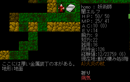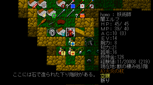 ついに獲得の巻物を引き当てたぞお。ここで願うのは杖一択ですかね。火炎の杖でもやっていけるが、今後は地の矢の魔法を平行して使うことになる。ゆえに妖術の杖が欲しいのです。