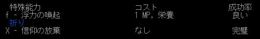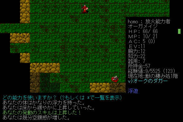 浮遊の指輪を装備したものの、効果発動の成功率は良い(つまり低い)です。このゲームはアイテム発動によるペナルティで突然変異をするらしい。浮遊は突然変異をしないから(たぶん)、ガンガン使って発動のスキルを上げよう。