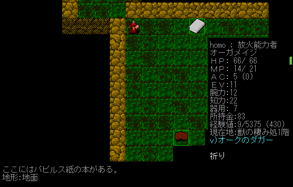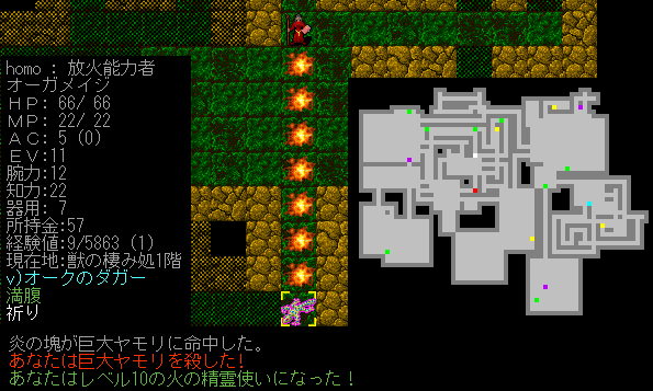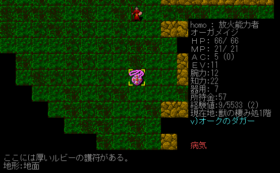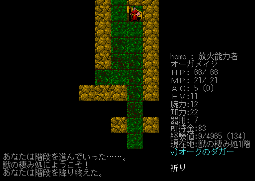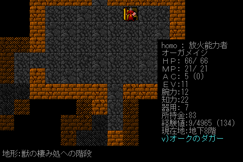 Dungeon Crawlのプレイ日記を始めます。オーガメイジ炎の精霊使いをプレイ中です。前回は地下8階にて『獣の棲み処』への入り口を発見。今度はゾットの罠を踏まずに攻略をしたい。オーガメイジをここまで連れてくるのは大変なんだよ。