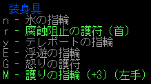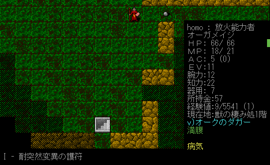 鑑定の結果『耐突然変異の護符』でした。こいつは良い物を拾ったなあ。だんじょんひらおよぎによると『突然変異を10分の9の確率で防ぐ』効果があるらしい。いちおう装備をしておきます。