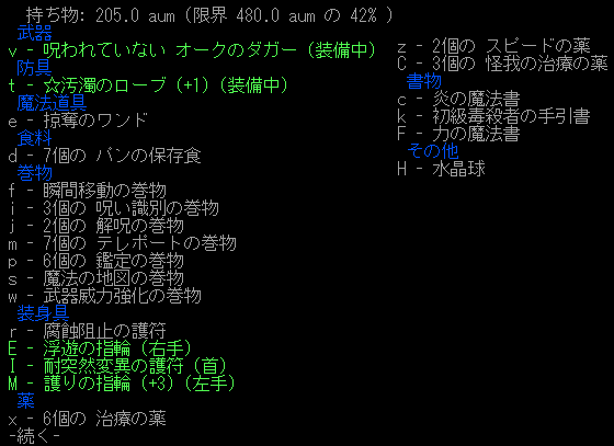 未鑑定の魔法書を発見しました。さっそく内容を確認します。浮遊の指輪を使いこなせなくて困惑中。ctrl+oにて探索をすると浮遊の効果が無くなっても進み続けるんです。使い方が下手なのかも。