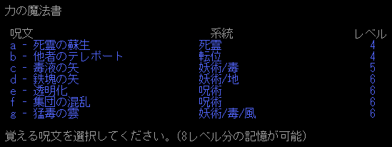 ざっと眺ると罠感知の魔法がない。残念だなと落胆をしたが、これはヴェフメットが2番目に下賜をする魔法書じゃないか(妖術使いの場合)。もう手に入れている場合は3番目の魔法書が早めに下賜されるのかな。