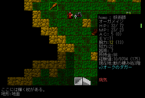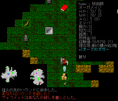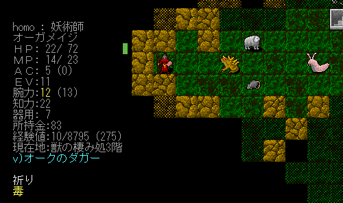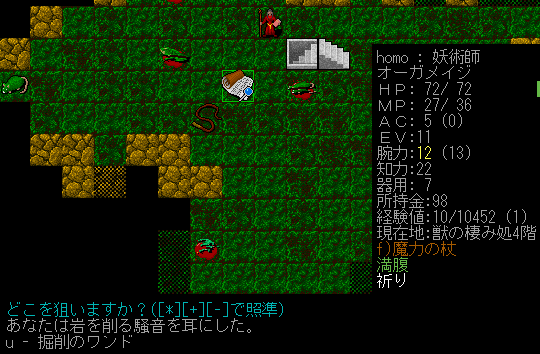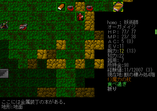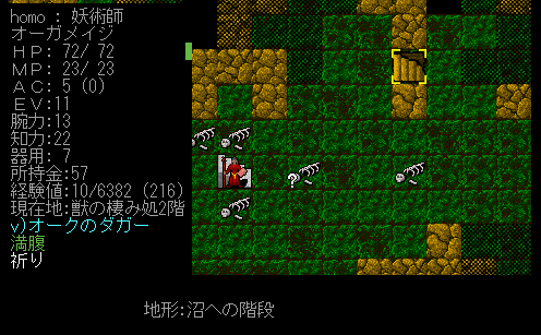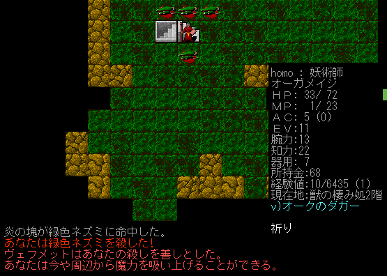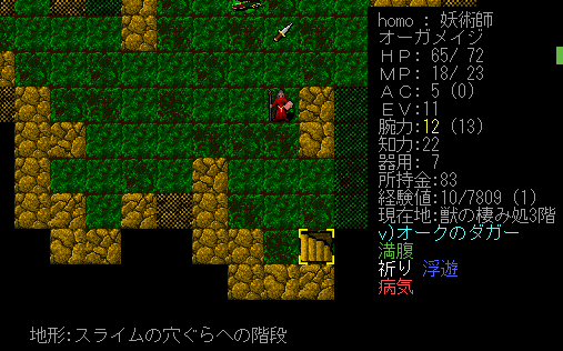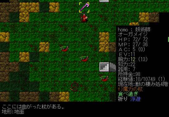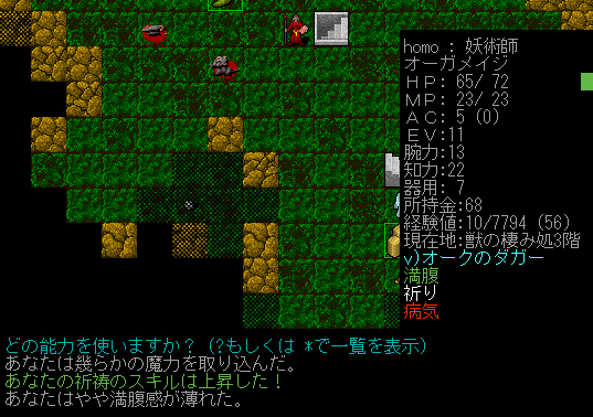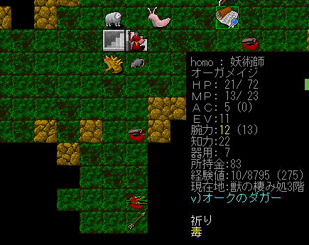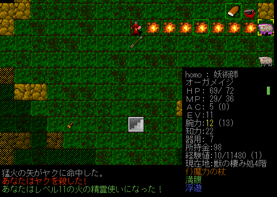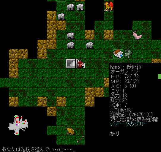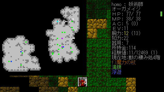 Dungeon Crawlのプレイ日記を始めます。オーガメイジ炎の精霊使いをプレイ中です。前回は獣の棲み処に到達。順調にアイテム集めをすることができました。今回は常に浮遊をしながら慎重に探索をしたいと思います(ctrl+oを使わない)。