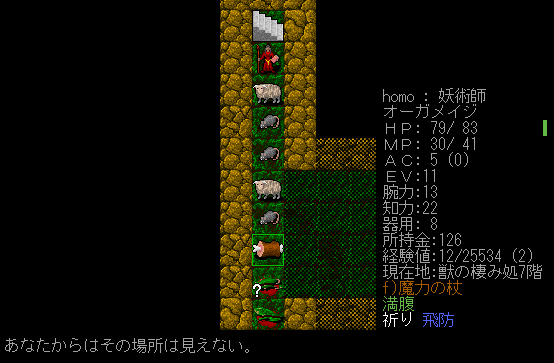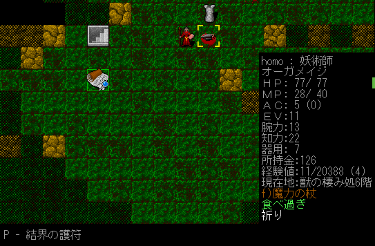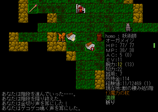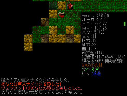 Dungeon Crawlのプレイ日記を始めます。オーガメイジ炎の精霊使いをプレイ中です。今回は呪術の魔法スキルを上げながら探索をしていきたい。『加速の魔法+耐突然変異の護符』のコンボを狙います。