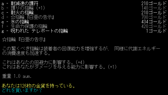 買いたい物はないかなあ。アーティファクトの指輪でEVを上げられるようだが悩ましい。生命力保持の指輪(衰弱耐性)は必須なのかね。序盤しか知らないから分からない。
