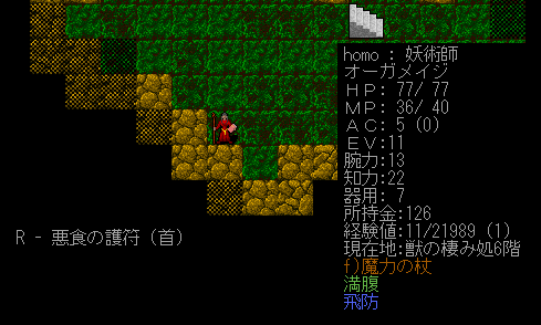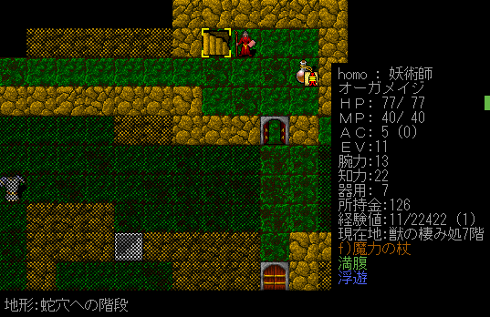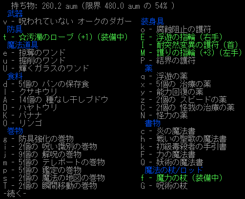 いらないアイテムを置いて身軽になりました。巻物は多いのだが薬とワンドが少ない。今回は持ち物が偏っていると思う。