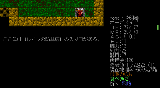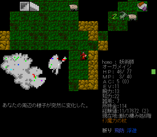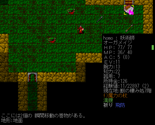 枯渇していた瞬間移動の巻物を見つけた!しかも2枚重なって落ちている(笑)。これで首の皮一枚の状況から脱出できるぞお。次は有用な薬が欲しいです。