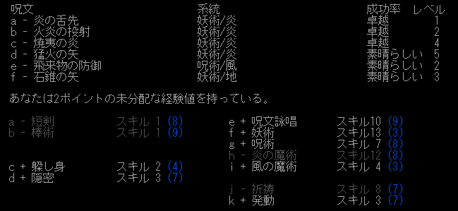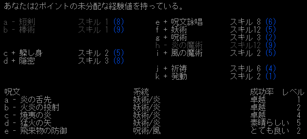 レベルが低いせいなのか、敵を倒すと大量のスキル経験値が貯まります。こいつを全て呪術に注ぎ込むのです。MPが減ったら魔力の吸収を使います。