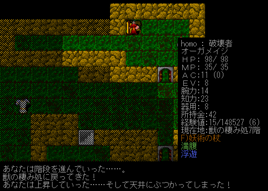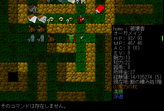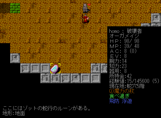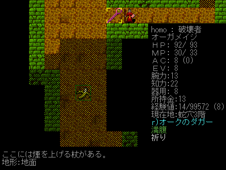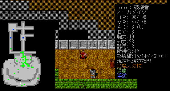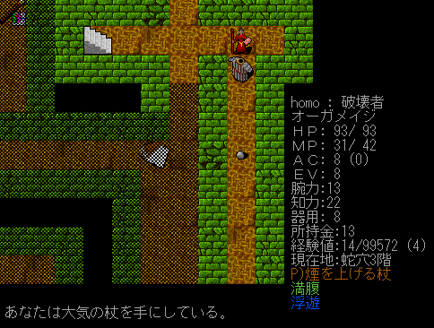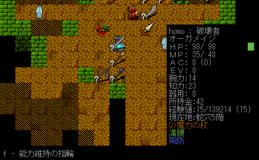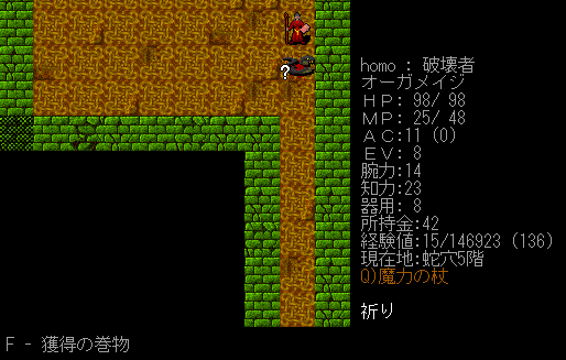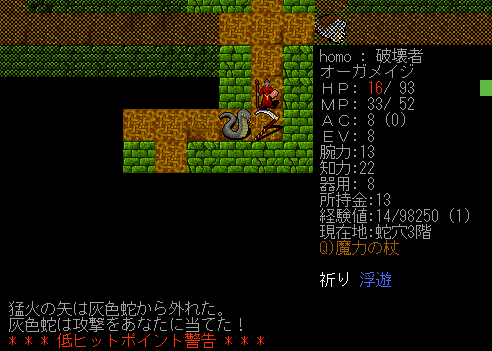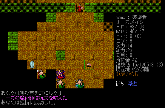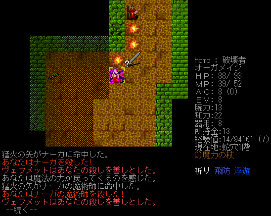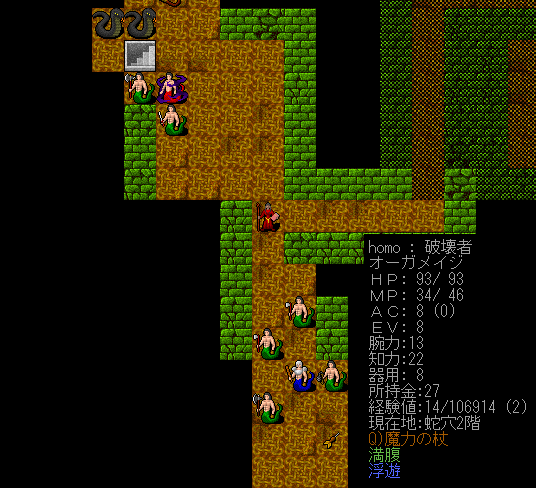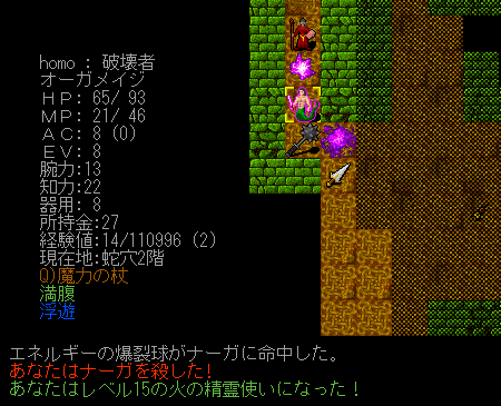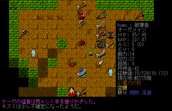 空腹を気にしなくても良いから魔法をガンガン連打しています。ナーガには負ける気がしないですね。蛇穴は危険なユニークモンスター(『アドルフ?)』、『ザッハ?』)が出現をするそうです。私は遭遇しなかったから運が良かった。