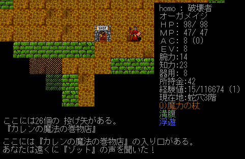 蛇穴3階にゾットの罠があるようだぞ。ビビっていたから巻物屋の品揃えをキャプチャできなかった。蛇穴には何度か武器を取りに入るだろうから3階は気をつけよう。