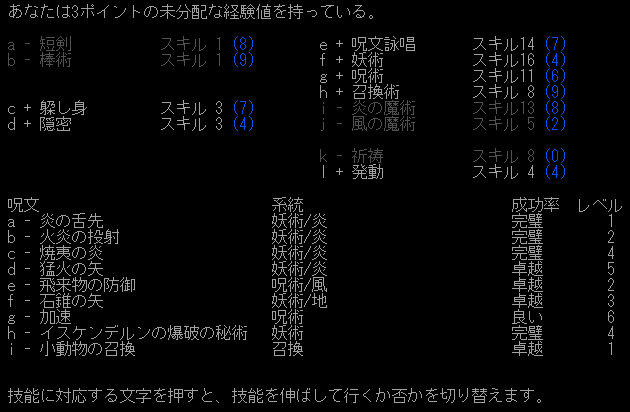 召喚のスキルレベルは7だ。10になればヴェフメットの祈りブーストでおぞましきものの召喚を使えるようになる(溜まり場からの情報)。感知の魔法が1つもないよお。