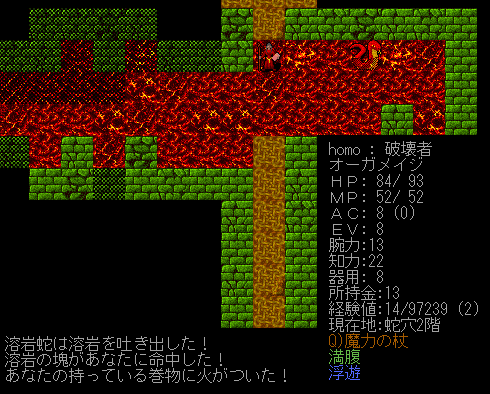 やばそうな溶岩の地形を移動していたら溶岩蛇に巻物を燃やされた!なんでどいつもこいつも俺の巻物を燃やすんだよ!保全の護符があればアイテムの破壊を防げるそうです。