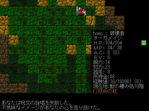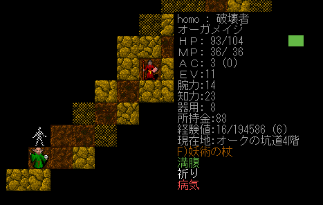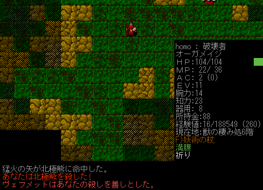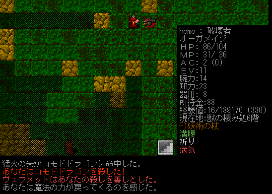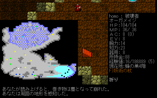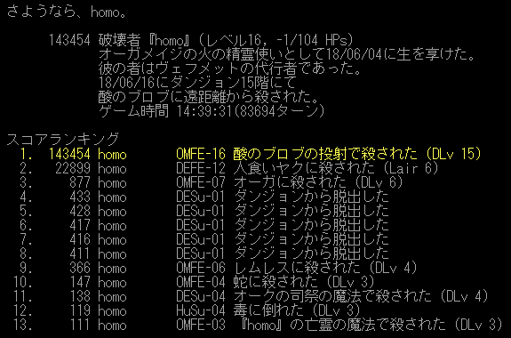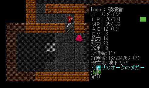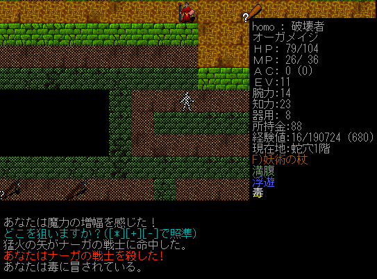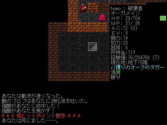 スピードの薬を飲んだ瞬間、攻撃をくらって死にました。そんな馬鹿なとショックをうけるが、プレイ日記を書いていたら非効率かつ間違ったプレイングをし過ぎていたと大反省。スピードの薬→瞬間移動の巻物の順番で対処していれば死ななかっただろうしね。