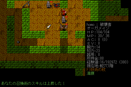 あまりにもスキル上げが好調なのでモンスター退治を続けてしまう。すると、いきなり30ダメージを与えてくる敵と遭遇。瞬間移動の巻物→スピードの薬で対応をしました。