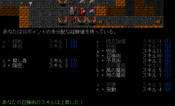 詠唱失敗のファンブルが怖いから予見のスキルレベルもあげている。モンスター感知を唱えないでサッサと召喚を上げれば良いのにね。