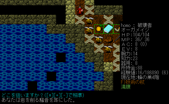 蜂の巣は全ての部屋を探索し終わったんだけど、4階の湖を渡ったところに小部屋があるらしい。浮遊を使わなくても堀削や分解のワンドを持っていれば入れるそうなので試します。