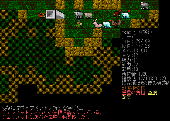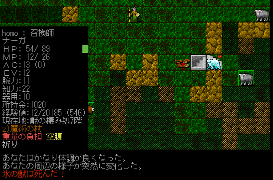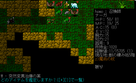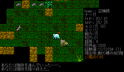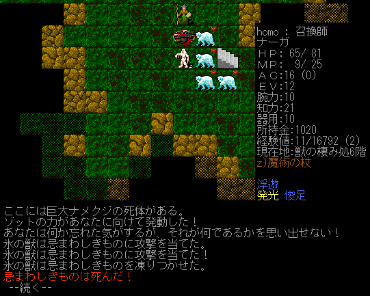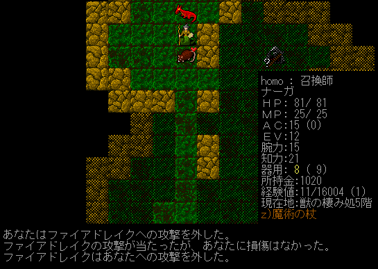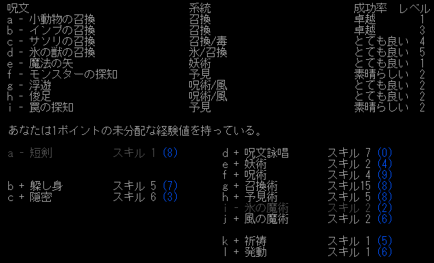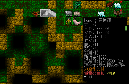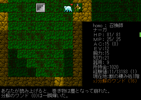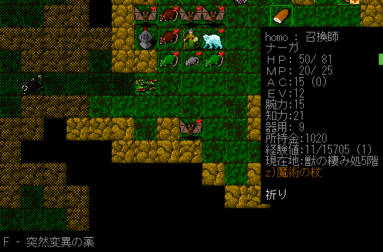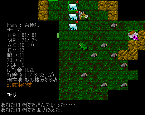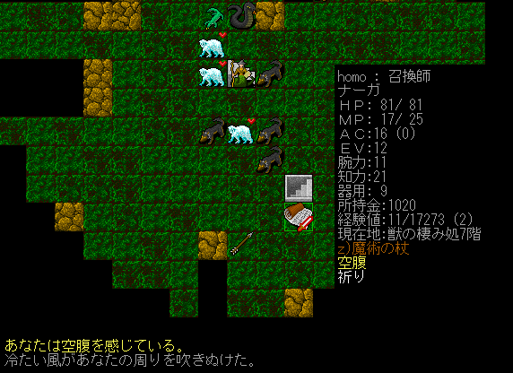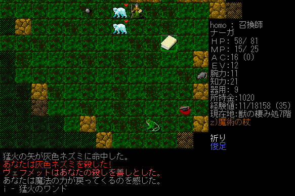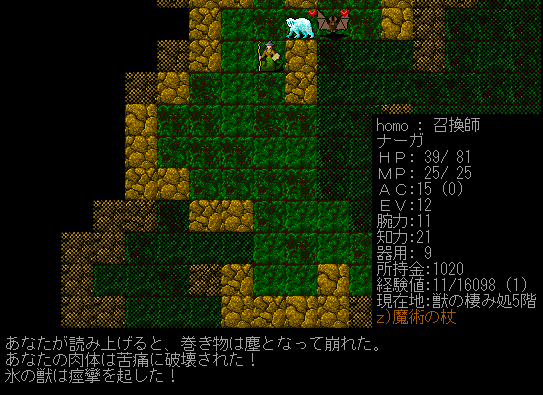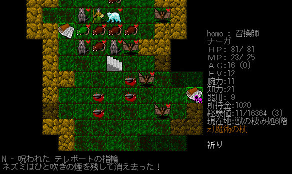 Dungeon Crawlのプレイ日記を始めます。ナーガ召換術師をプレイ中です。今回は獣の棲み処の探索を進めます。今から妖術を鍛えて猛火の矢を覚えようかと悩んだ。召喚術と妖術を同時に使うのは難しいからやめました。解放の宣誓や招来などを記憶して召喚術を極めます。