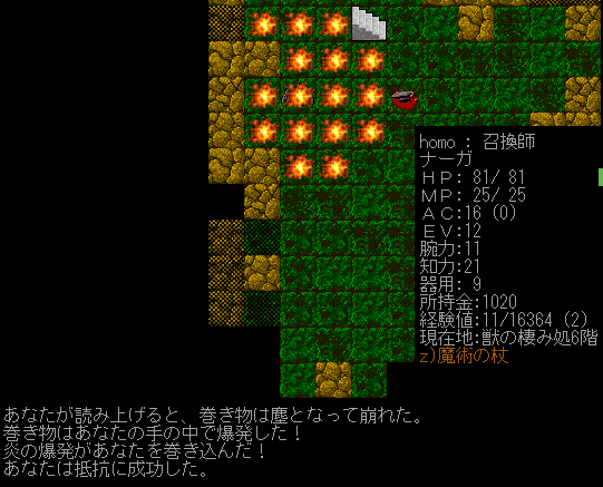またまた未鑑定の巻物を読む。どうせだったら武器を装備すれば良いのにね。焼き討ちの巻物を見つけました。キャンプで誤爆しなくてよかった。