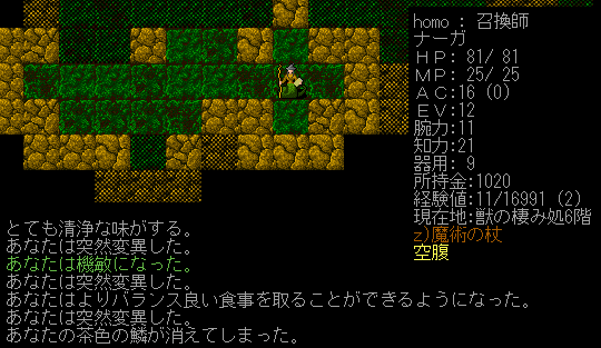 発光が収まりました。途中で良性の変異だけになるも(笑)、最後に肉を消化できない変異をくらう。なんという迂闊なプレイだ。突然変異治療の薬を飲みます(泣)。