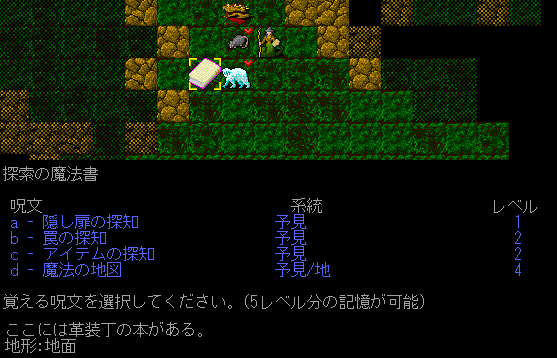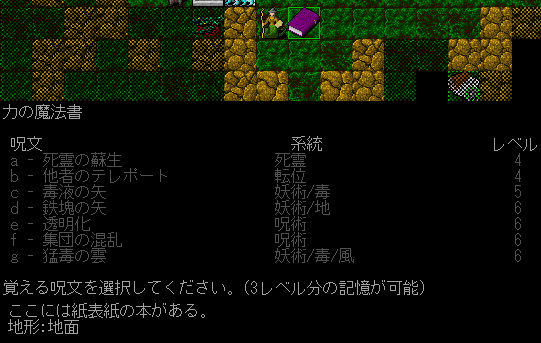 未鑑定のワンドを振ったら猛火のワンドだった。これを使ってヒドラを倒せば経験値を多くもらえると思うもやめておく。たかが知れているから緊急回避用に持っていよう。落ちている魔法書を確認します。
