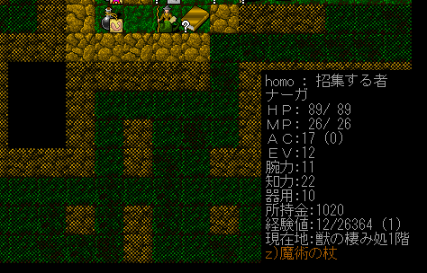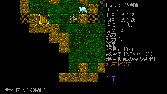 蛇穴への階段を発見。獣の棲み処の入り口が深い階層だったから蛇穴で強いユニークが出てくるかもしれない。ザッハとかアドルフとかね。侵入する時は出会うのを前提で対策を組もう。