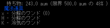 分解のワンドで壁を壊して使い切ってしまおう。こいつは強敵に隣接された際の攻撃手段になるから魔力充填の巻物を使って管理した方が良い。