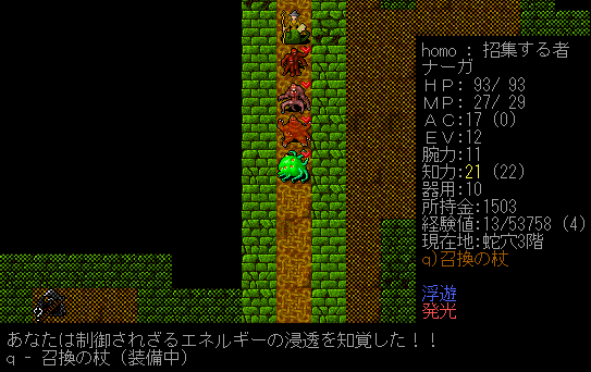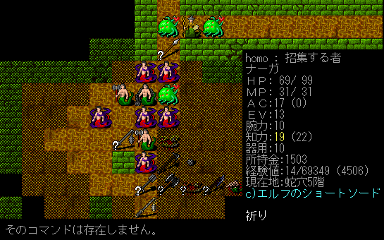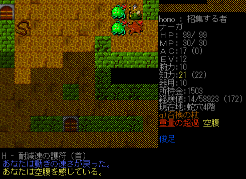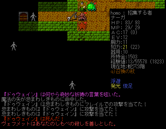 おぞましきものの召換を2~3回唱えて殲滅完了。高レベルの魔法だから戦闘中に腹が減っちゃう。相手がナーガだからモンスターの肉を食べても隣接されることはなかった。沼だと無理なんだろうなあ。