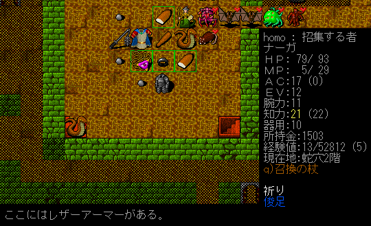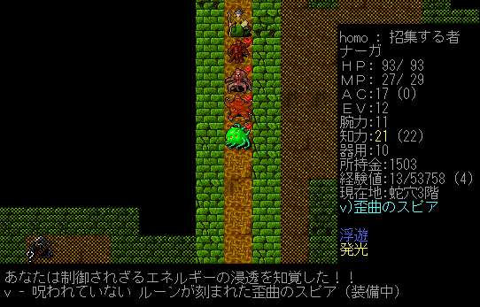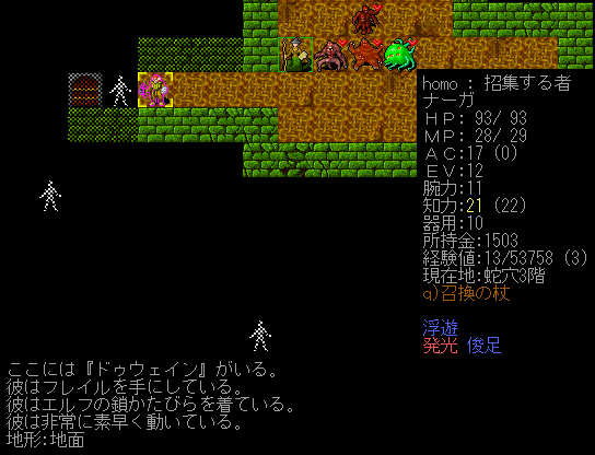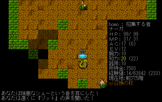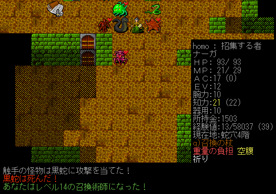 Dungeon Crawlのプレイ日記を始めます。ナーガ召換術師をプレイ中です。前回は『おぞましきものの召喚』を習得。運良く詠唱に成功をして蛇穴の敵をサクサク倒しております。