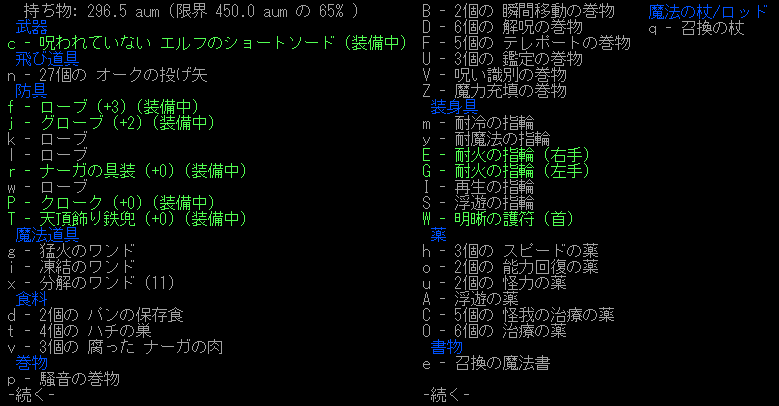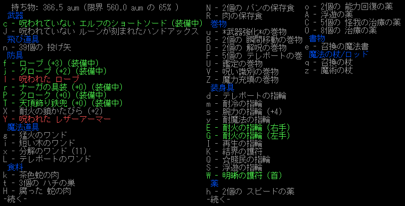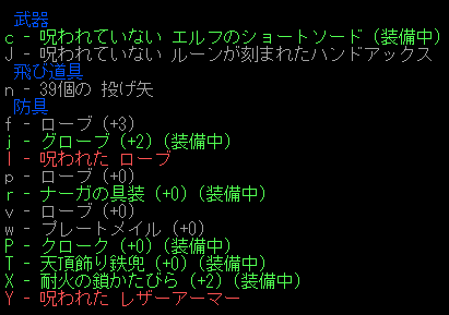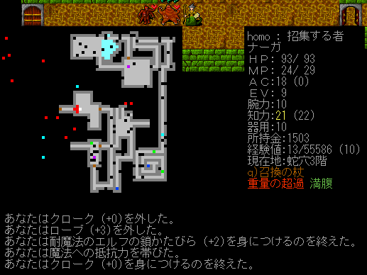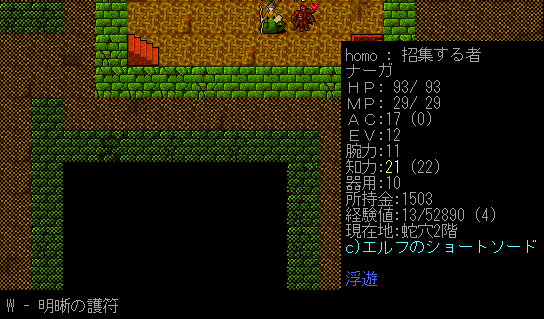 耐魔法のエルフの鎖かたびらを見つけた。だけどナーガは鎧を上手く着れないからACはローブと変わらん。地図がどんどん記憶から失われていますね。そのうちボロボロになり無と化します。