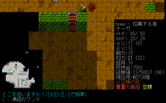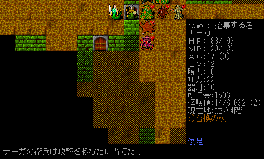 ナーガの衛兵と遭遇。こいつの肉を食べると突然変異をするんだよね(たぶん)。そんな危険な敵が何げなく現れるって怖いな。