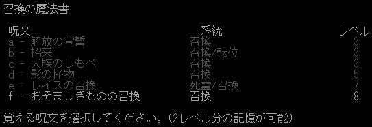招来の呪文を記憶しました。この呪文がないと死ぬだろうとは考えていたからね。次の呪文を覚えられるのはいつになるんだとイラだつ。