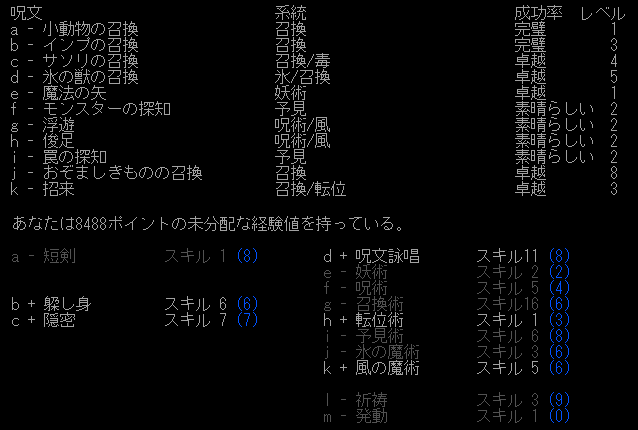 呪文詠唱のスキルが上がり2レベル分の記憶ができるようになった。招来は3だからレベルアップすれば記憶できるな。招来がないとキツいよ(泣)。