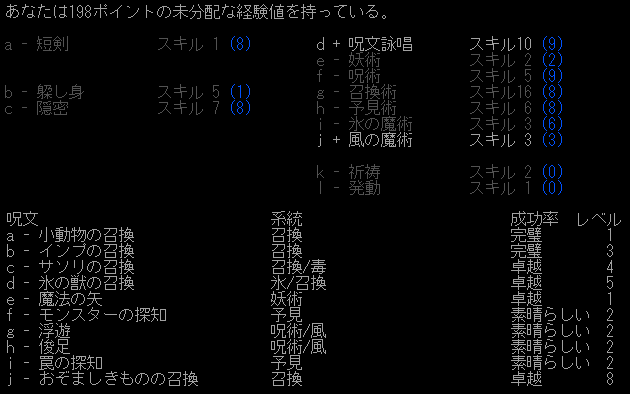 引き続き、呪文詠唱以外のスキルを抑制します。風の魔術だけは上げておこう。獲得の巻物を手に入れたら大気の杖(電気の耐性)が欲しいから。
