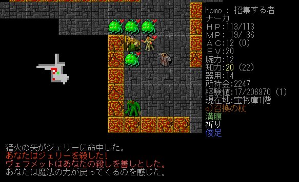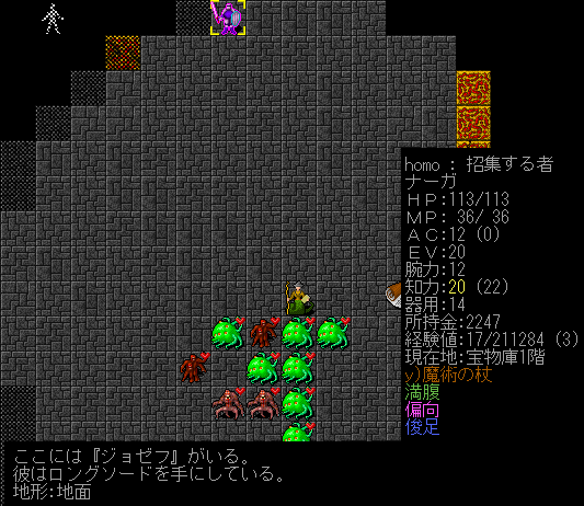 Dungeon Crawlのプレイ日記を始めます。ナーガ召換術師をプレイ中です。vault内に宝物庫への入口を発見。邪魔な敵はあらかた倒しました。残党を掃討したら宝物庫へ侵入をします。