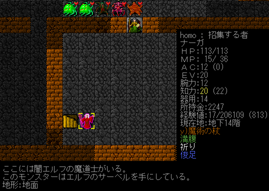 敵は全て倒したはずなのにエルフの魔道師が湧いて出てきやがった。vaultがあった階だから地下14階は強敵が現れやすいのかもしれない。キャンプのある場所なのに困ったなあ。