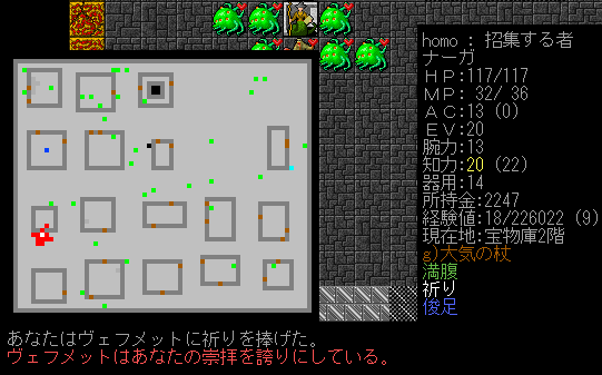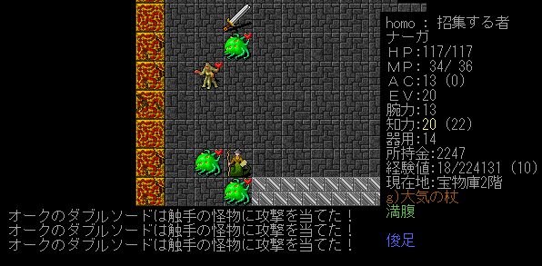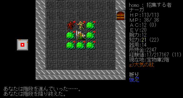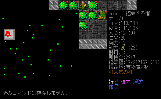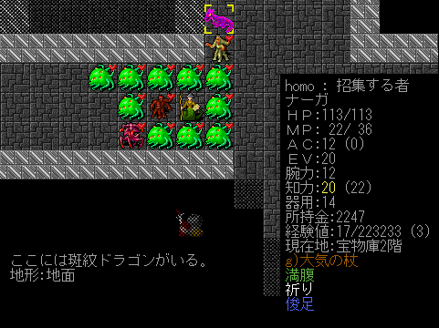 Dungeon Crawlのプレイ日記を始めます。ナーガ召換術師をプレイ中。宝物庫を攻略しています。久しぶりにプレイを再開したので現状を確認しよう。