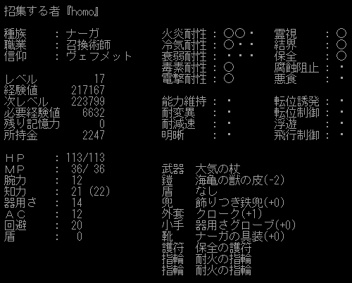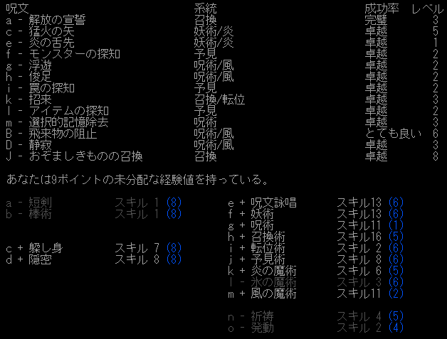 間違えて唱えたらまずい呪文は大文字に置き換えました。成功率は召換の杖を持った時のもの。大気の杖なしで飛来物の阻止を唱えられるようにしたい。絶縁の装飾品が手に入れば耐性のついた武器を装備できるからです(鬼が笑う)。