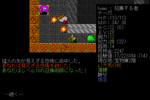 見えざる恐怖を倒してレベルが18に上がる。順調だが喜んでいる場合ではない。常時浮遊や飛来物の阻止をサボりだしている。雑なプレイをしていたらそのうち死ぬ。