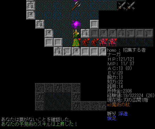 攻略をした人は分かると思うけど、上の画像にある広間への出口は危ない。見通しが悪いからいきなり敵と接近することもある。取得した経験値は罠探知を唱えまくって予見スキルにつぎ込みました。