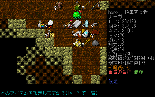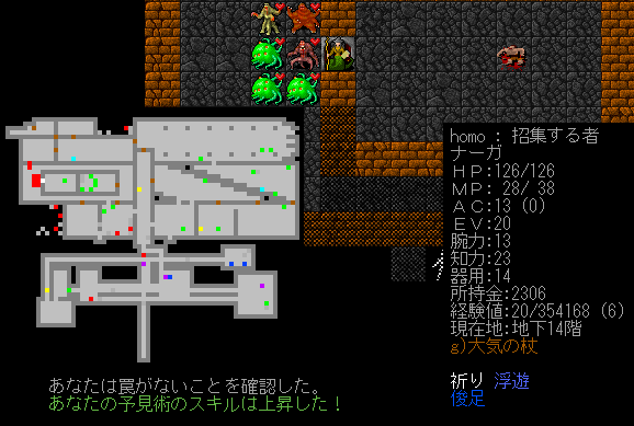 敵の経験値はそこそこ旨いという感じ。アイテム感知をすれば敵の場所がわかるのかな(眠かったから忘れた)。なんと数十体もいたんですねえ。経験値不足で悩んでいる自分にとっては美味しいダンジョンだ。