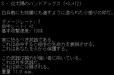耐火のつくハンドアックスを見つけました。火炎耐性が足らなかったら装備をするかも(笑)。自分は火炎の杖を最終装備にしても良いとすら考えています。